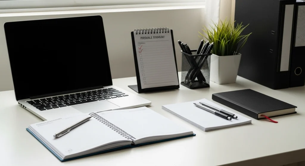 A imagem mostra o momento de fechamento da semana de forma prática e realista. Em um ambiente organizado e tranquilo, a pessoa revisa anotações, compromissos e pendências antes de encerrar a sexta-feira, transmitindo a ideia de clareza, preparação e continuidade bem planejada para a próxima semana.