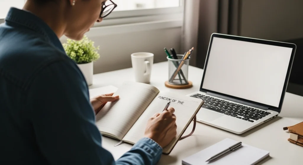 Pedido mais útil: “Cena fotorrealista de uma profissional revisando anotações ao lado de um notebook em mesa simples, ambiente interno bem iluminado por luz natural, enquadramento médio, clima de concentração, visual cotidiano de trabalho no Brasil, sem texto, sem marcas e sem excesso de objetos.”