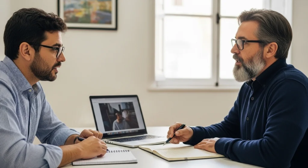 A imagem representa o momento em que a pessoa percebe que ajustar sozinho já não é suficiente e decide buscar outro olhar. Em vez de insistir apenas na tentativa individual, a cena mostra uma troca real, com análise conjunta e discussão prática.