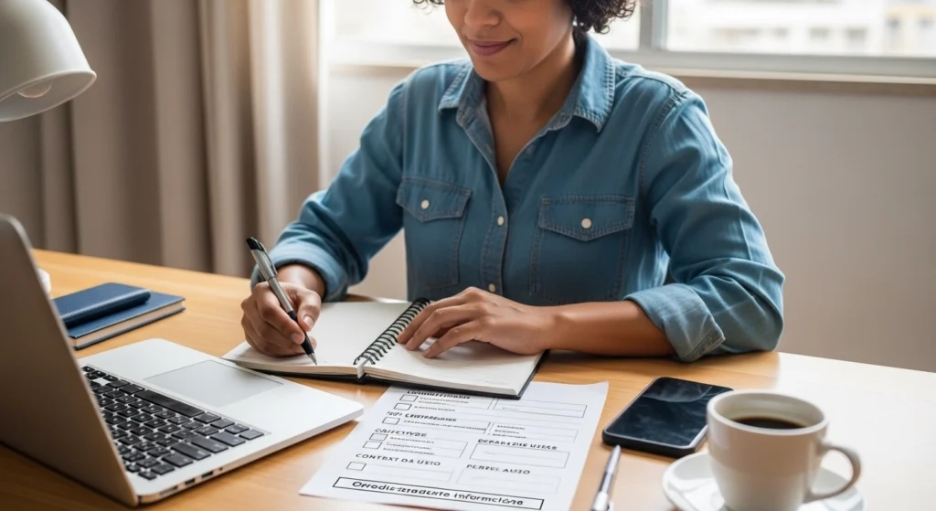A imagem retrata um momento de preparação antes de tomar decisões futuras. A pessoa organiza critérios e estrutura melhor suas perguntas, mostrando um processo mais consciente e estratégico. O ambiente simples e a postura concentrada reforçam a ideia de prevenção, evitando erros e retrabalho nas próximas escolhas.