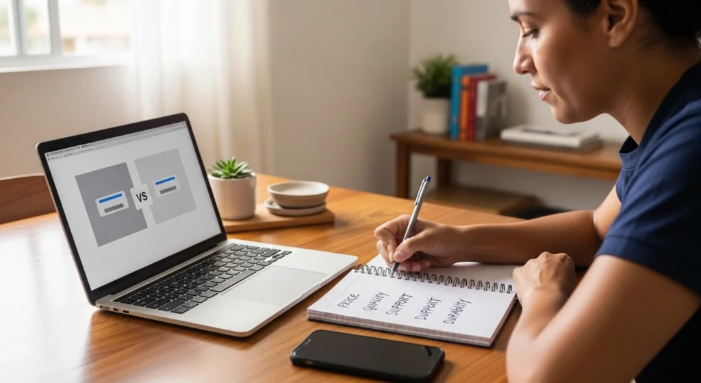 A imagem mostra uma pessoa analisando duas alternativas com atenção, organizando critérios importantes antes de decidir. O ambiente simples e a luz natural reforçam uma cena cotidiana, enquanto as anotações indicam que a escolha está sendo feita com base em fatores práticos, e não apenas em aparência ou preço.