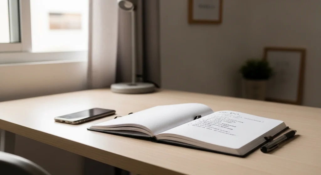 A imagem mostra um ambiente de trabalho simples, onde o foco está em um caderno com uma lista de tarefas. O cenário transmite leveza e praticidade, sem distrações ou complexidade visual. A luz natural reforça a sensação de clareza e organização, representando bem momentos em que uma lista direta e objetiva é suficiente para guiar o dia.