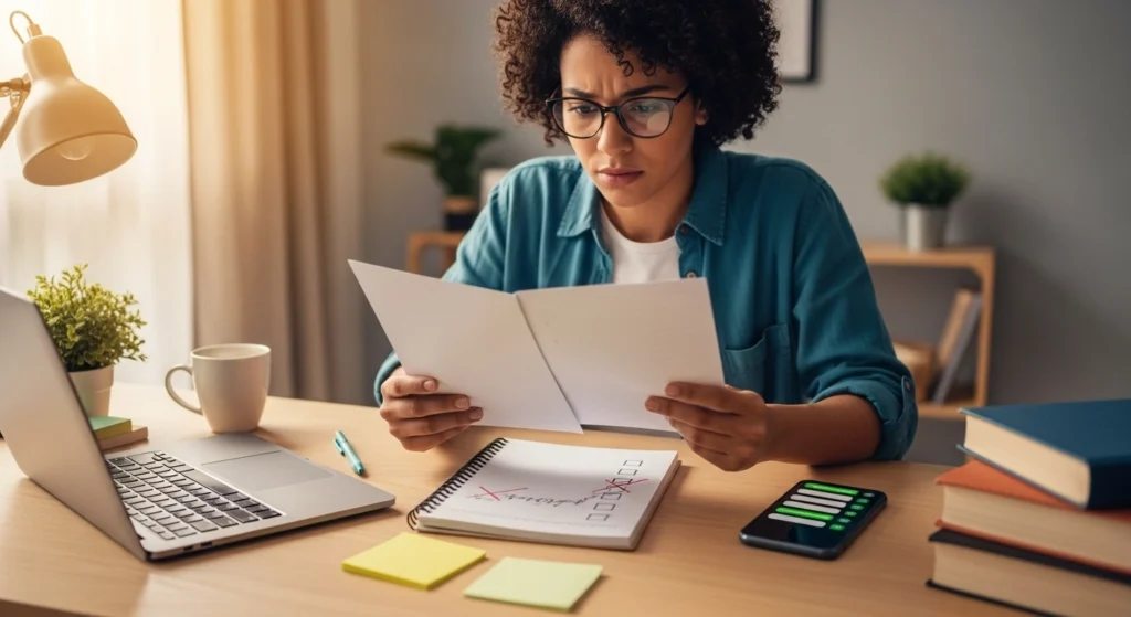A imagem retrata uma pessoa revisando cuidadosamente sua pergunta antes de enviá-la, utilizando um checklist para garantir clareza e neutralidade. O ambiente organizado e a postura atenta sugerem um hábito de análise crítica, evitando respostas fáceis ou convenientes. A cena transmite a ideia de que pensar antes de perguntar é uma forma prática de melhorar a qualidade das respostas recebidas.