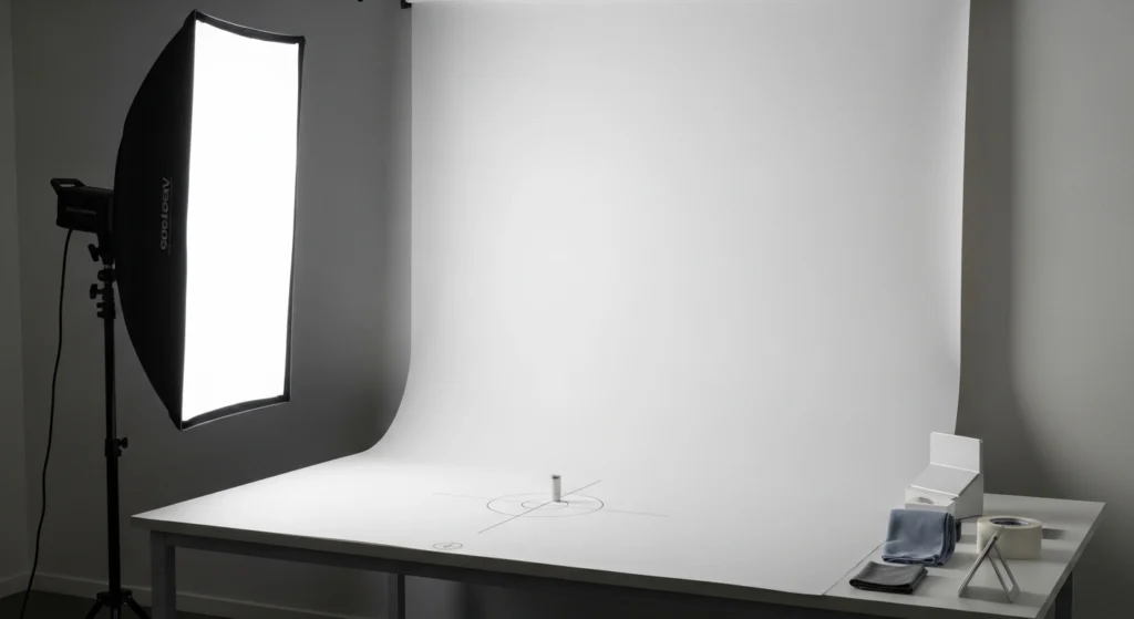 Coloque o produto a certa distância do fundo, em vez de encostar tudo no painel. Esse afastamento reduz sombra dura e facilita separar o contorno do objeto na imagem final.
