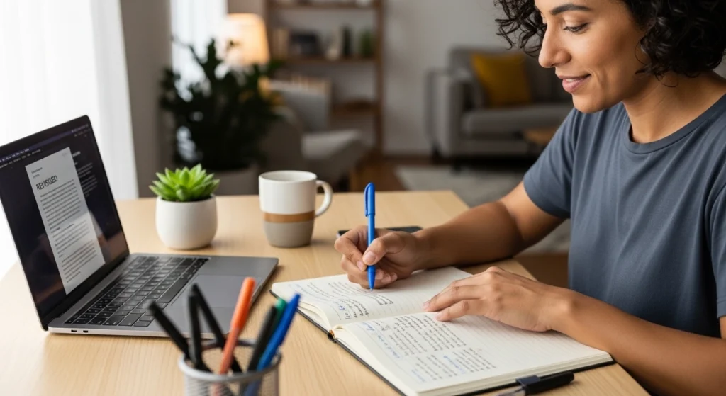 A imagem retrata um momento de organização e revisão após o entendimento de um conteúdo. As anotações estruturadas mostram que a pessoa conseguiu transformar algo confuso em algo claro e reutilizável. O ambiente limpo e a expressão tranquila indicam que a prevenção da confusão está ligada à organização prática e à revisão consciente do aprendizado.