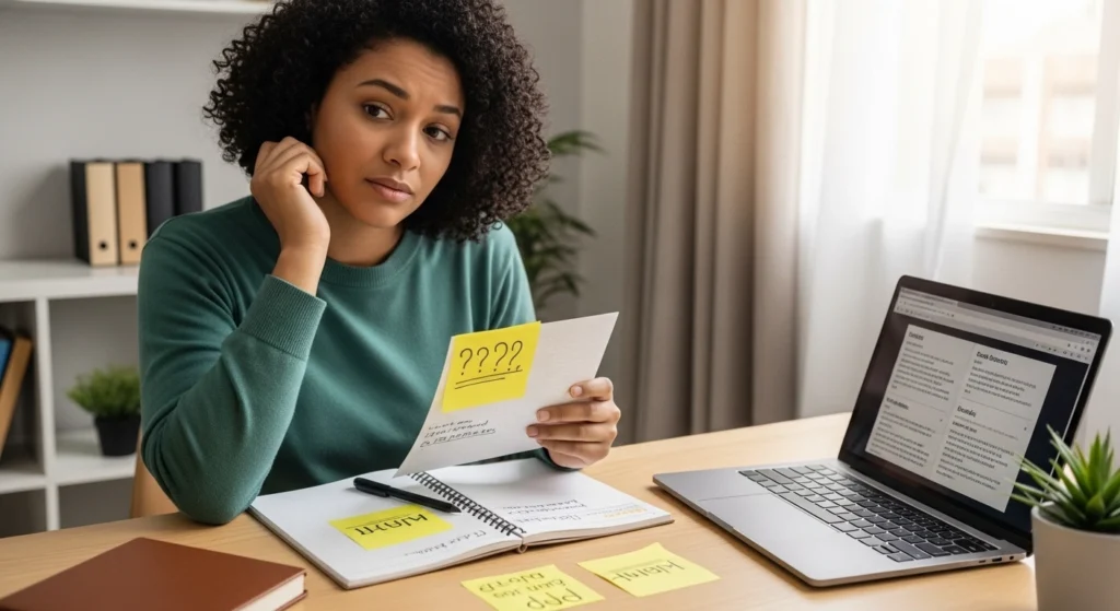 A imagem mostra uma pessoa em um momento de análise, tentando entender exatamente onde está a dificuldade em um conteúdo. As anotações destacadas indicam tentativa de separar o que já foi compreendido do que ainda gera dúvida. O ambiente simples e a expressão focada reforçam a ideia de que o entendimento começa quando a confusão é organizada em partes menores.